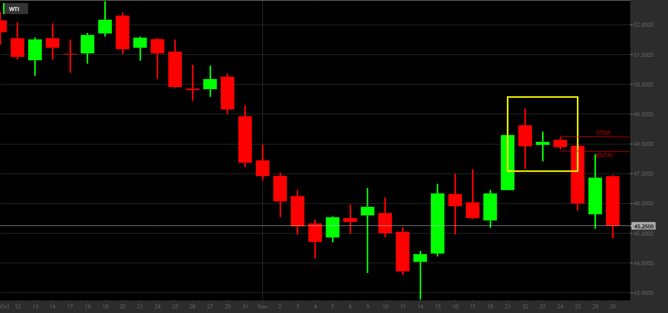 Tale pattern sfrutta una momentanea pausa nel trend, le ultime due candele si sono mosse in uno stretto trading-range generando una forte compressione della volatilità. Essendo la volatilità ciclica, a periodi di bassa volatilità si alternano momenti di alta volatilità, è proprio questo che andremo a sfruttare attraverso questo pattern di prezzo.