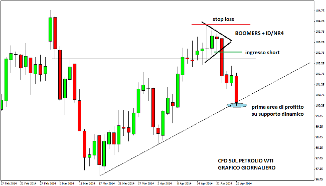 Si può notare che si forma un boomers, ovvero un triangolino caratterizzato dalla presenza di due candele inside consecutive, dove l’ultima seduta di trading è anche una ID/NR4, ovvero una candela inside che ha anche il range più piccolo delle ultime 4 sessioni di trading. Tale compressione della volatilità genera un boom dei prezzi verso il basso, che consente al trader di beneficiare di un ottimo rapporto rischio/rendimento. Sul grafico in alto viene indicato anche il livello di ingresso, di stop loss e di take profit.
