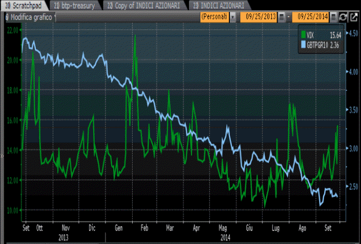 Rendimento del BTP decennale (linea blu) e volatilità VIX (linea verde) da 1 anno a questa parte.