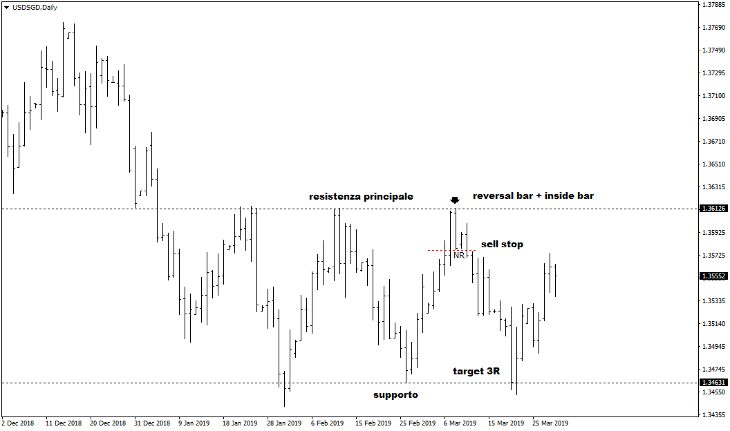 Andiamo a dare un’occhiata all’esempio grafico mostrato in alto sul tasso di cambio USD/SGD, ossia il rapporto tra il dollaro americano e il dollaro di Singapore. Il daily chart evidenzia una fase laterale sui bottom, dopo un trend discendente durato almeno un mese e mezzo. In questi casi è facile individuare le zone di supporto e resistenze più importanti, ovvero le regioni del prezzo sulle quali si “gioca la partita” tra i compratori e i venditori. Agli inizi di marzo 2019 il raggiungimento della resistenza di area 1,3610 favorisce la formazione di una reversal bar, subito accompagnata da una inside bar.