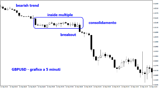 E’ il caso, ad esempio, del tasso di cambio GBPUSD mostrato nel grafico a 5 minuti qui in alto. Si può notare che, lungo un solido bearish trend direzionale, si forma una stretta congestione caratterizzata da ben 18 candele inside contenute all’interno di una long mother candle ribassista. E’ un segnale di forte compressione della volatilità. Ciò indica che, in caso di breakout deciso di uno dei due estremi del consolidamento, potrà esserci un nuovo robusto movimento direzionale dei prezzi. E’ quanto avviene in questo caso, con il Cable che perderà più di 50 pip nei minuti successivi.