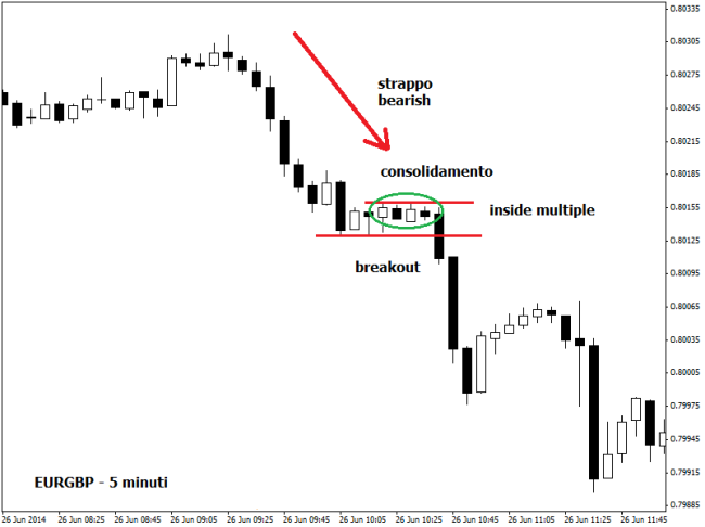 Il grafico mostrato in alto si riferisce al tasso di cambio EUR/GBP, ovvero euro su sterlina, time frame a 5 minuti, interessato da uno strappo ribassista dopo l’apertura dei mercati europei. Dopo questo movimento direzionale si forma uno stretto consolidamento. Appare un setup piuttosto preciso, ovvero le inside multiple. Nella fattispecie si tratta di tre candele inside contenute all’interno di una candela detta “madre” (mother candle). Il breakout ribassista offrirà allo scalper una buona occasione short, con un rapporto rischio/rendimento molto favorevole.