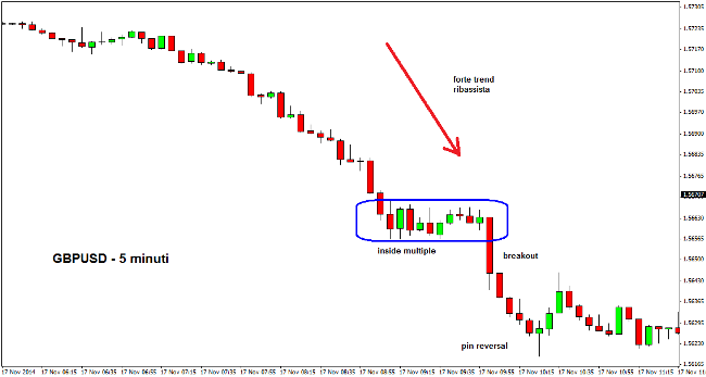 Per capire meglio il pattern grafico andiamo ad analizzare il chart a 5 minuti mostrato in alto sul tasso di cambio GBPUSD, ovvero sterlina su dollaro americano ("Cable"). Si può notare innanzitutto un notevole bearish trend, consolidatosi nel corso della sessione asiatica. Dopo l’apertura dei mercati europei si forma una stretta congestione con inside multiple. Il breakout ribassista, in linea con il trend di fondo, è il segnale short da sfruttare in ottica di scalping o day-trading.