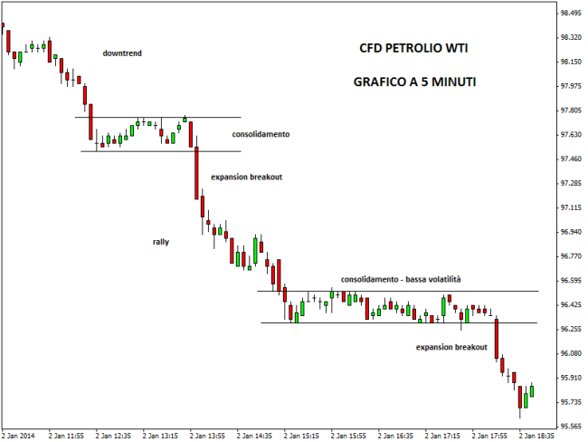 Per capire meglio il concetto, andiamo a dare un’occhiata al grafico a 5 minuti del CFD sul petrolio WTI, che viene interessato da un bearish trend intraday piuttosto definito. La comparsa di strette fasi di consolidamento del trend mostra come il mercato sia ingabbiato, ma pronto ad esplodere in qualsiasi momento nella direzione della tendenza principale. Dal grafico in alto si può notare il rally del mercato ogni volta che è avvenuto il breakout esplosivo delle fasi di congestione.