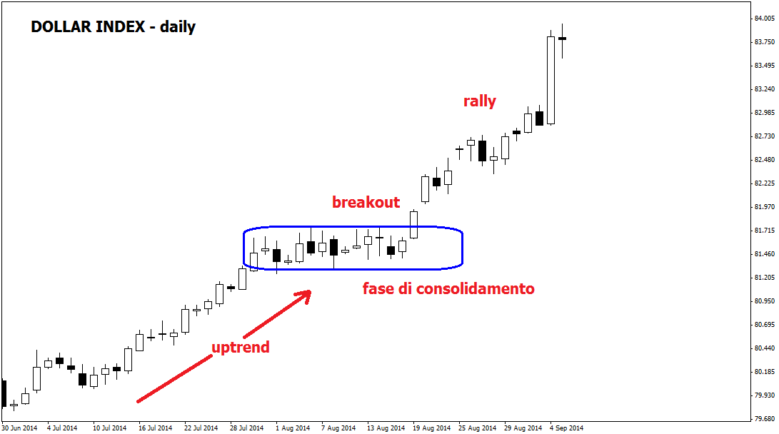 Il grafico mostrato in alto si riferisce al Dollar Index, time frame giornaliero, analizzato attraverso il CFD settembre 2014. Si può notare subito un forte movimento direzionale bullish dei prezzi, che a un certo punto perde forza solo per dare il via a una fase di consolidamento di oltre dieci giorni. Il successivo breakout al rialzo sarà il segnale long da sfruttare, in ottica di swing trading di breve termine. Il superamento della resistenza di area 81,80 – 82 farà volare i prezzi fino in area 84 in poco più di venti giorni. A fronte di un rischio iniziale decisamente basso, era possibile spuntare un rendimento potenziale altisonante.