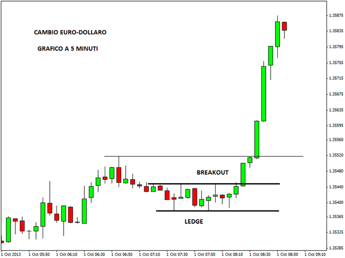 Se osserviamo il grafico a 5 minuti del cambio euro-dollaro, possiamo notare la formazione di un ledge, che presenta due massimi e due minimi corrispondenti ma non necessariamente consecutivi tra di loro. L’ideale è attendere sempre la chiusura della candela di breakout, in quanto potrebbero esserci falsi segnali per ingannare gli scalper sulla reale direzione del mercato. Alla fine il breakout del ledge offre una buona opportunità di guadagno, a fronte di un rischio limitato.