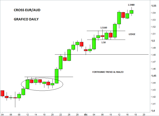 Osservando il grafico giornaliero del cambio euro/dollaro australiano è possibile notare la presenza di un fortissimo bullish trend. A un certo punto il cambio raggiunge nuovi massimi pluriennali a 1,5160 e inizia a formare un ledge. L’estremo basso della micro-congestione è un’area chiave, ovvero la soglia psicologica di 1,50. Il trade è facile da impostare: long al superamento di 1,5160 e stop loss sotto 1,50. Nei giorni successivi i prezzi saliranno tantissimo, fino a sfiorare quota 1,55.