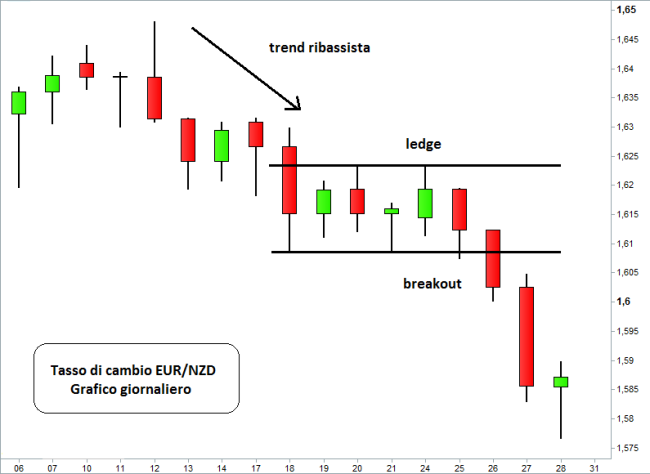 Il grafico in alto mostra l’andamento del tasso di cambio EUR/NZD (euro contro dollaro neozelandese), time frame giornaliero, interessato da un trend discendente molto solido. La formazione del ledge è un segnale di continuazione della tendenza primaria, che si attiva sulla violazione della parte bassa del range della congestione. A seguito del breakout ribassista, i prezzi continueranno a scendere con intensità evidenziano un nuovo rally. La successiva formazione della pin candle sui bottom di periodo indica, invece, un probabile esaurimento della spinta dei venditori.