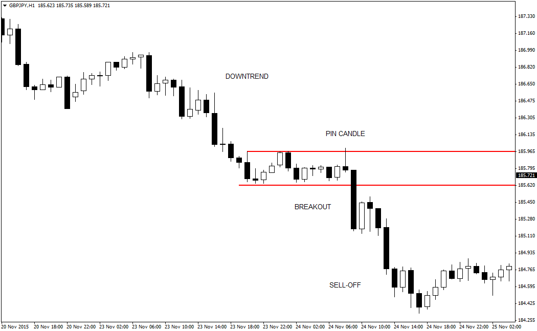 Il grafico analizzato è su base intraday, time frame a 60 minuti. Si può notare che i prezzi, all’interno del rettangolo, incontrano difficoltà a proseguire verso l’alto (formazione di una pin candle sulla resistenza), mentre grazie a un sontuoso breakout ribassista riescono a dare il via a un significativo sell-off nel giro di poche ore.