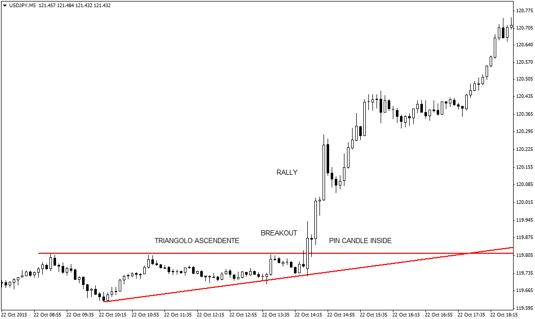 Oggi andiamo ad esaminare in dettaglio un pattern dell’analisi tecnica classica da sempre molto apprezzato dai trader. Si tratta del triangolo, che spesso viene a configurarsi anche con forme più irregolari come il cuneo (o wedge). Il caso di studio odierno si riferisce a un triangolo ascendente apparso sul tasso di cambio Dollaro/Yen, grafico intraday a 5 minuti. Il pattern si forma sui bottom di giornata e va ad identificare una fase di accumulazione dei large traders.