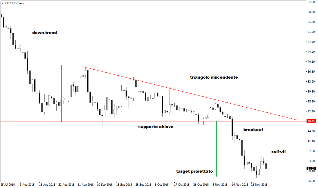 Il grafico daily mostrato in alto sul Litecoin (LTC/USD), tramite il suo CFD, evidenzia innanzitutto un bearish trend molto solido e poi una fase di consolidamento che a un certo punto mette in mostra un triangolo discendente. Trattasi di pattern di continuazione del trend, pertanto il successivo breakout espone il mercato in questione a nuovi approfondimenti ribassisti. La criptovaluta continuerà a perdere valore, passando dal supporto chiave di area 48,5 a circa 27. Da notare come il target proiettato del pattern abbia individuato perfettamente il punto di approdo dei prezzi dopo il breakout.