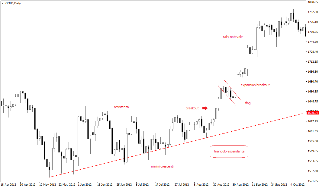 Il grafico mostrato in alto mostra come il breakout della resistenza abbia posto le basi per un trend solido e duraturo, che porterà la quotazione del metallo giallo da area 1.630 dollari l’oncia a quasi 1.800 dollari. Un vero e proprio boom, che poteva essere catturato seguendo semplici linee guida basate sulla tecnica del breakout.