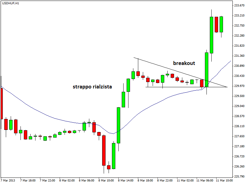 Oggi andiamo a studiare una delle figure elementari di continuazione del trend previste dall’analisi tecnica classica, ovvero il triangolo. Rappresenta una afse di congestione e/o pullback dei prezzi dopo uno strappo del mercato. Nell’esempio mostrato sul tasso di cambio USD/HUF, ovvero dollaro americano su fiorino ungherese, time frame a 60 minuti, si può notare la formazione di un triangolo di continuazione del trend dopo un forte strappo bullish delle quotazioni. Il triangolo evidenzia anche una fase di compressione della volatilità, durante la quale il mercato torna ad accumulare posizioni nella direzione del trend principale. Il breakout del triangolo dà il via a una nuova fase bullish, offrendo così un day-trade con un buon rapporto rischio/rendimento.