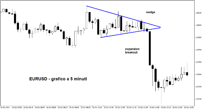 La forte contrazione della volatilità generata dal wedge, però, è spesso in grado di dare vita a poderosi movimenti direzionali del prezzo. Per capirne meglio le potenzialità andiamo a osservare il grafico intraday mostrato in alto sul tasso di cambio euro/dollaro, time frame a 5 minuti. Si può notare come, a seguito della comparsa di un wedge, avvenga poi un expansion breakout eccezionale grazie al quale era possibile sfruttare una ghiotta opportunità short in ottica di scalping.