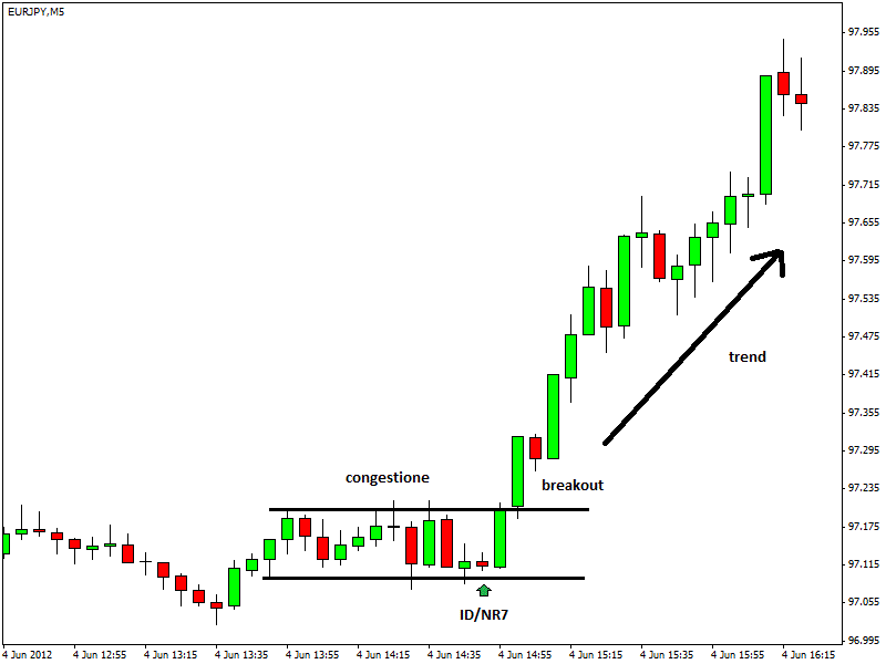 Il breakout è stato esplosivo anche per un altro motivo. La candela precedente a quella di breakout è una ID/NR7, cioè una candela inside con il range più piccolo delle ultime sette. L’esplosione della volatilità è rilevante e nei minuti successivi si forma subito un contesto di mercato favorevole al rialzo dei prezzi. A fronte di un rischio di una dcina di pip, era possibile guadagnarne almeno 50-60 nelle ore successive.