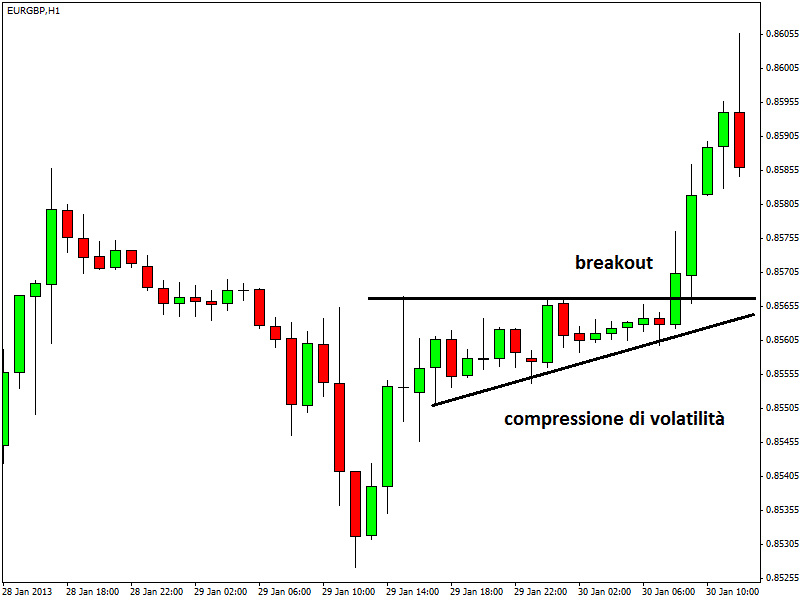 Oggi andiamo ad analizzare un case study riferito al tasso di cambio euro/sterlina, time frame a 60 minuti, dove è possibile identificare una fase di compressione di volatilità intraday. La marcata riduzione della volatilità è racchiusa all’interno del triangolo di continuazione del trend, che cattura la fase laterale con il più basso livello di volatilità di breve periodo.