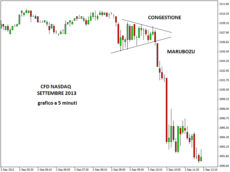 Le long marubozu sono, quindi, un ottimo strumento tecnico per intervenire sui breakout della volatilità e del prezzo. Andiamo a vedere l’esempio relativo al CFD sull’indice azionario americano Nasdaq, scadenza settembre 2013, time frame a 5 minuti. Si può notare la formazione di un breakout di un triangolo accompagnato da una long marubozu. Il segnale short è netto e avrebbe offerto una buona opportunità di guadagno in ottica di scalping.