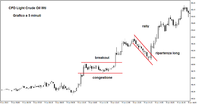 Dopo la fase di consolidamento il mercato tende poi a ripartire con decisione nella direzione della tendenza primaria. Nel grafico in alto si può notare proprio questa situazione, che nella fattispecie interessa il mercato del Light Crude Oil Wti, time frame a 5 minuti, analizzato tramite un CFD. Un trend emergente rialzista sperimenta una pausa: il consolidamento intraday dura quasi due ore, poi il breakout della congestione segna l’inizio di un poderoso rally.