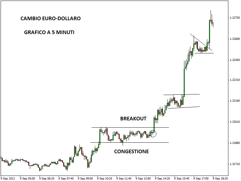 Nel case study mostrato sul tasso di cambio euro-dollaro, time frame a 5 minuti, si può notare la formazione di una candela ad ampio range (nella fattispecie un expansion breakout intraday) che supera di slancio una fase di congestione dei prezzi. Il breakout è reale e confermato nei minuti successivi. Nel corso della giornata il trend dei prezzi diventerà sempre più solido, nella direzione del breakout della congestione.