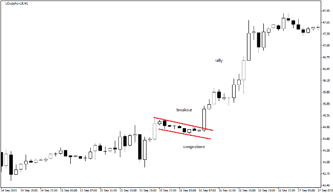 Le fasi di congestione dei prezzi, soprattutto quelle con volatilità molto bassa, possono rappresentare una grande opportunità di trading su qualsiasi orizzonte temporale. Il successivo breakout della congestione, che sia essa un rettangolo o un triangolo, può dar vita a movimenti direzionali esplosivi. L’esempio mostrato in basso si riferisce al mercato del greggio, analizzato su un chart a 60 minuti e quindi utile per il day trading.