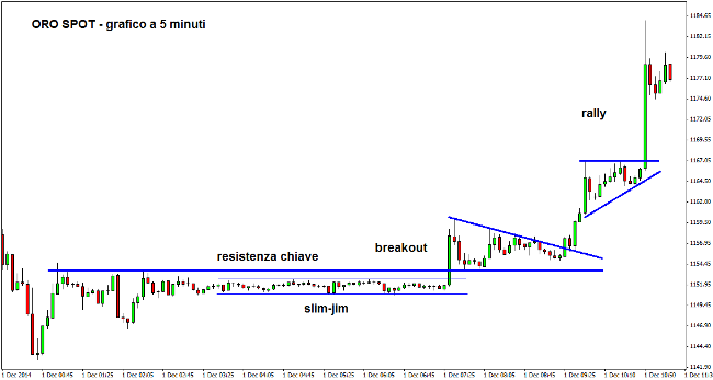 Il mercato si muove da un estremo all’altro in un range risicatissimo. E’ qui che i big boys, le mani forti del mercato, accumulano o distribuiscono grosse posizioni prima di spingere i prezzi nella direzione desiderata. In alto è stato mostrato uno slim-jim rialzista apparso sul Gold, time frame a 5 minuti. Il breakout del pattern ha fatto scattare un bullish trend davvero straordinario, che ha offerto agli scalper e ai day-trader un’opportunità di profitto senza precedenti.