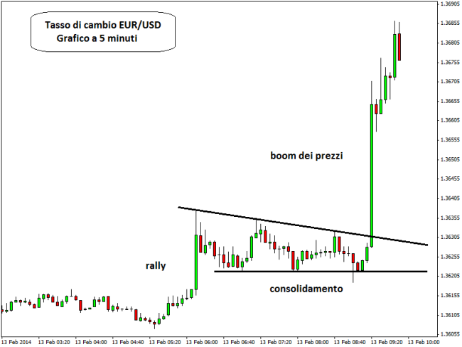 Le fasi di consolidamento intraday, che fanno seguito a un violento boom delle quotazioni, sono perfette per valutare l’apertura di una posizione sul mercato nella stessa direzione del trend primario. Queste congestioni hanno una durata più o meno lunga. Nel mercato intraday possono durare un’ora, ma a volte anche alcune ore. E’ chiaro che quanto più è lunga e stretta la congestione, tanto maggiore sarà il boom dei prezzi se dovesse esserci il breakout. Oggi andiamo ad analizzare un interessante caso di studio sul tasso di cambio EUR/USD, che ha sperimentato una fase di consolidamento intraday.