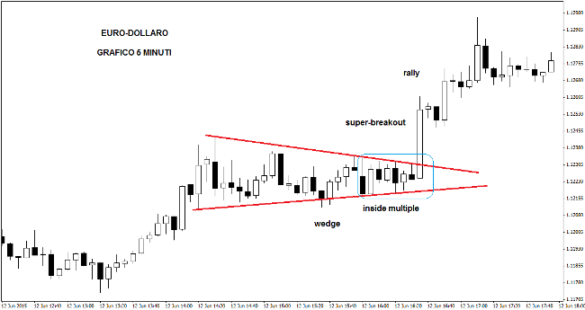 Il grafico in alto è relativo al tasso di cambio euro/dollaro (EUR/USD), time frame a 5 minuti, interessato dalla formazione di una fase di congestione intraday. A un certo punto all’interno del wedge si formano ben 6 candele inside consecutive, che stanno a indicare un’ulteriore compressione della volatilità. Il successivo breakout, sia delle candele inside che del wedge, scatena un rally eccezionale che in poco più di mezz’ora fa guadagnare al cambio oltre 60 pip.
