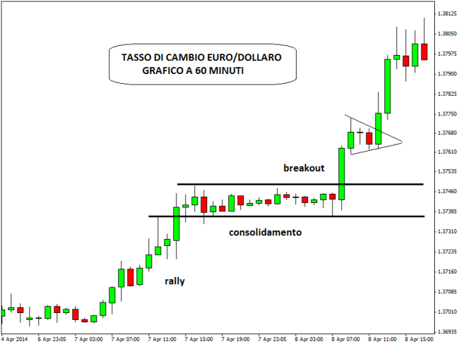 Chi preferisce fare trading intraday o scalping dovrebbe analizzare i grafici a 5 minuti (operatività di brevissimo respiro) oppure a 60 minuti (per il day-trading). Il grafico in alto sul tasso di cambio euro/dollaro (EUR/USD), time frame a 60 minuti, mostra un breakout esplosivo di una afse di consolidamento, che fa seguito a un rally dei prezzi. La rottura avviene con una long candle, che in questo caso è un expansion breakout: il segnale long è decisamente affidabile. Nelle ore successive i prezzi saliranno con forza, offrendo una buona opportunità di profitto.