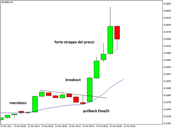 Nell’esempio mostrato sul tasso di cambio EUR/SEK (euro su corona svedese), si può notare la comparsa di una marubozu candle dopo una fase laterale con bassa volatilità. Il breakout viene seguito da un pullback dei prezzi verso la Ema20. Il pullback è breve ed è solo una pausa dopo il primo strappo del mercato. Ben presto i prezzi tornano a salire con decisione, offrendo un’ottima opportunità di scalping.