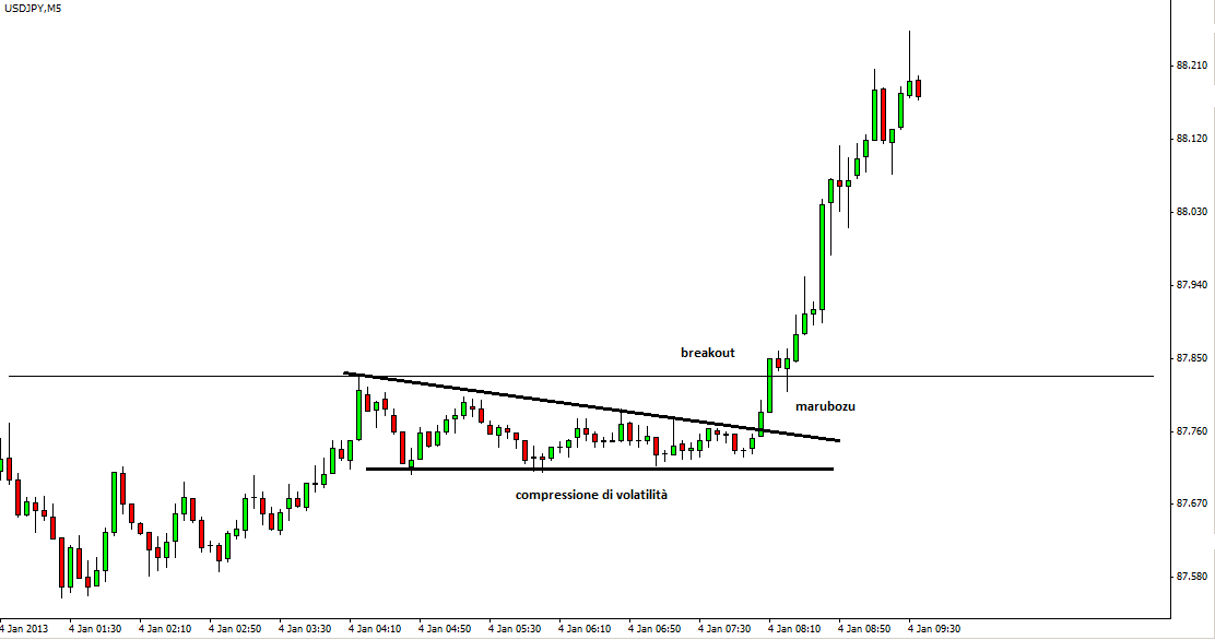 Oggi andiamo ad analizzare un case study molto interessante, relativo al tasso di cambio dollaro/yen. Il grafico mostrato è quello a 5 minuti, per cui si riferisce ad un’operatività di trading intraday. L’esempio mette in evidenza una delle modalità di ingresso sul mercato più semplici in assoluto, ovvero la tecnica del breakout.