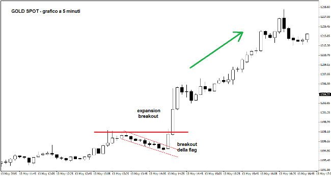 Il grafico in alto del Gold spot, time frame a 5 minuti, evidenzia un rally eccezionale dei prezzi a seguito di due breakout: il primo è quello di una flag e di una fase di forte contrazione della volatilità; il secondo è un pattern ben preciso, che prende il nome di Expansion Breakout. Da sottolineare che il superamento della soglia psicologica di 1.200$ l’oncia favorisce un boom notevole, che spingerà i prezzi sempre più in alto nelle ore successive.