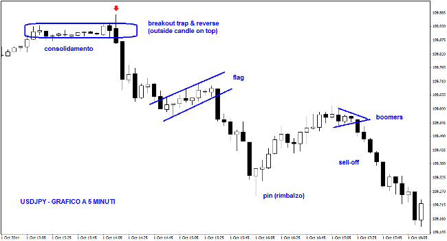 Il case study presentato qui in alto si riferisce al tasso di cambio USDJPY, ovvero il dollaro rapportato allo yen. Il time frame è il 5 minuti, l’ideale per fare scalping e/o day trading. Il breakout trap & reverse appare sui top del mercato. Inoltre si forma dopo il falso breakout di una fase di consolidamento. Il segnale short è davvero bello e consente al trader di beneficiare di un basso rischio iniziale, a fronte di un rendimento potenziale enorme. Nelle ore successive il cambio sarà in bear market, offrendo interessanti opportunità di profitto.