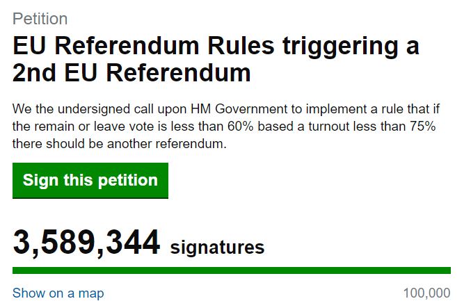 La petizione era stata avviata con dall’attivista favorevole alla Brexit William Oliver Healey nel mese di maggio, quando i sondaggi davano il Remain in testa.