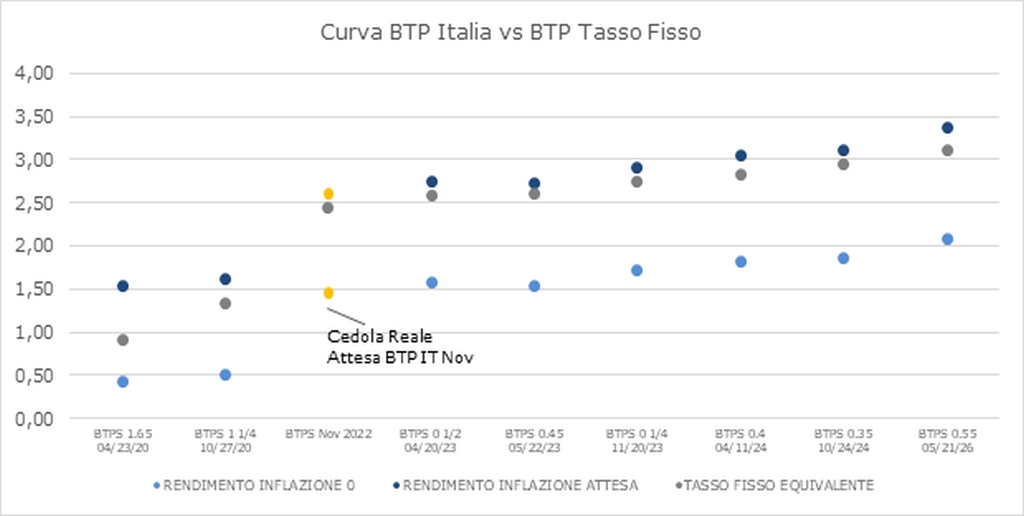 “Considerata la curva dei Btp a tasso fisso tale cedola fornirebbe al titolo un rendimento prospettico a scadenza del 2,6% circa, ovvero 20Bps al di sopra della curva dei Btp nominali”, rileva Rescigno in seguito alla comunicazione del Tesoro della cedola reale minima fissata all’1,45% del Btp Italia novembre 2022.