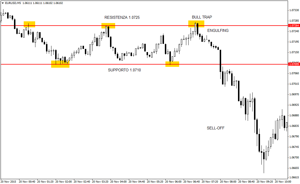Se si osserva il grafico intraday a 5 minuti in alto sul tasso di cambio Euro/Dollaro, si può visualizzare la formazione di una netta bull trap in zona di resistenza lungo una fase laterale decisamente prolungata. Qui appare anche un bearish engufing, che conferma la bontà del falso breakout. Successivamente avverrà anche la perdita del supporto del trading range, a seguito del breakout. Il risultato sarà in ogni caso molto positivo per i “sell”.