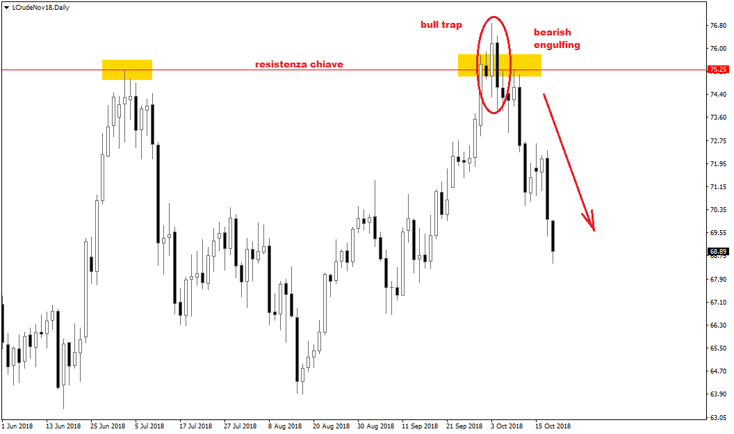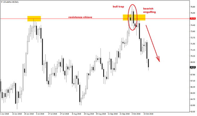 Da quel livello, nel corso dell’estate, i prezzi erano già precipitati fino in area 64 $ al barile. La tendenza primaria viene confermata tra settembre e inizio ottobre. A un certo punto sembra esserci anche il breakout decisivo della resistenza. In realtà tale rottura è un falso breakout. Una tipica bull trap, che mette in gabbia un gran numero di compratori. La conferma di tale scenario di potenziale inversione del trend viene ben presto confermata dalla comparsa di un minaccioso engulfing, uno dei candlestick setup statisticamente più profittevoli.
