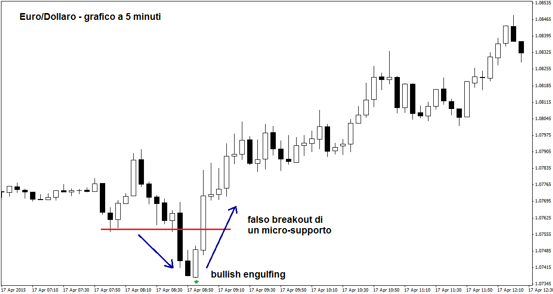 Il grafico in alto del cambio EUR/USD, time frame a 5 minuti, mostra la comparsa del pattern sui minimi intraday. Il segnale long viene ben presto rafforzato dalla presenza di un falso breakout (di un micro-supporto), che si presenta così come una delle più classiche bear trap (trappoli per Orsi, ovvero per venditori). Chi era posizionato short deve chiudersi rapidamente per non incorrere in perdite troppo pesanti, favorendo la risalita dei prezzi. Nel giro di poche ore il cambio guadagna circa 100 pip.