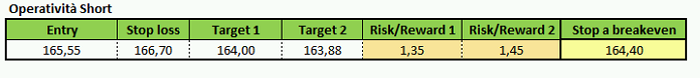 A tal proposito, si potrebbero valutare operazioni di matrice short con punto di entrata individuabile a 165,55 euro. Lo stop loss andrebbe posto a 166,70 euro, l’obiettivo principale a 164 e il target finale a 163,88.