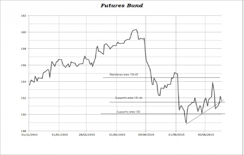 Dopo aver toccato il minimo in area 148.20, anche a seguito delle tensioni sulla Grecia, il future sul Bund è iniziato a risalire, riprendendo un breve trend rialzista.