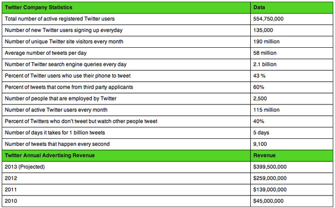 Un recente studio ha evidenziato come dal 2009 in poi si è passati da 35 milioni di utenti a più di 554 milioni di utenti che gettano in rete circa 58 milioni di twitt al giorno. Il profilo dell’utente tipo di twitter può essere molto diversificato: si va dal professionista della comunicazione, vip o politico che ogni giorno dice la sua sul fatto del giorno al classico "signor nessuno" che commenta o risponde ai twitt di persone note, fa sapere ad amici e follower cosa sta facendo o semplicemente legge le notizie pubblicate da altri. Di seguito una breve tabella con alcuni dati emersi da uno studio effettuato di recente sul fortunato social network e pubblicato sul sito di Statistic Brain.