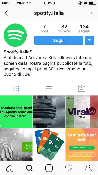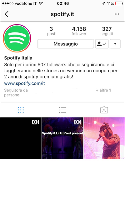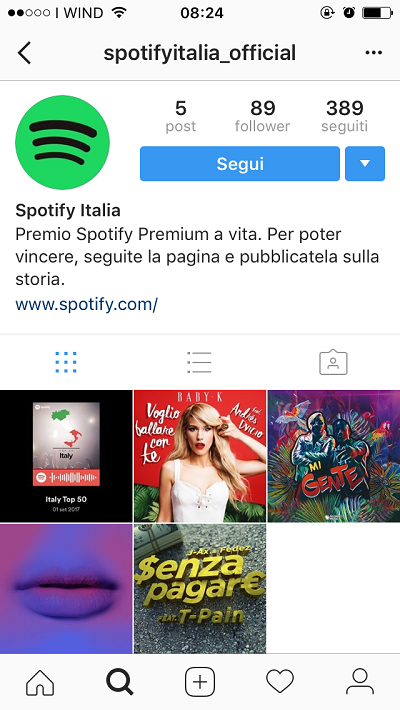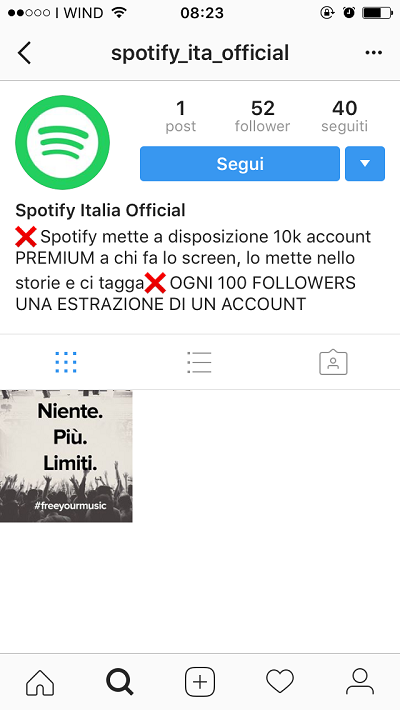 L’account Instagram della pagina è quello di Spotify Italia, e anche il logo è lo stesso. Ce ne sono diverse, ma nessuna di queste ha la spunta blu che indica che l’account è verificato, quindi ufficiale. Le descrizioni variano, ma riportano tutte più o meno la stessa cosa: