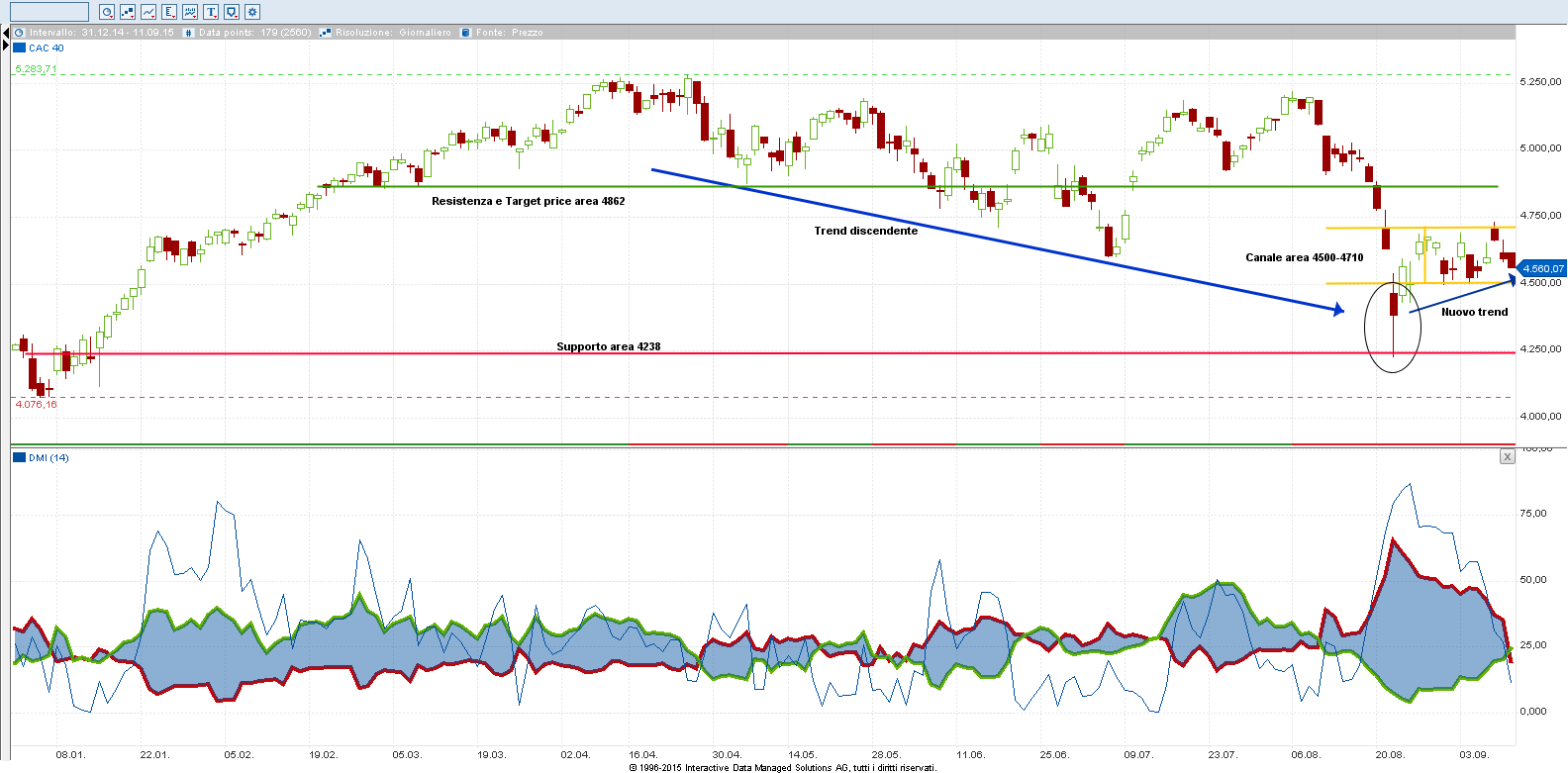 Dopo il crollo del 24 agosto, dove è stato segnato un minimo in area 4240, il l’indice francese CAC, dopo un recupero violento che lo ha portato a chiudere il gap apertosi il 24 agosto, si è stabilizzato in una fascia tra i 4500 ed i 4710 e dove sembrerebbe pronto a reimpostare l’inizio di un trend, per ora di breve, a rialzo.