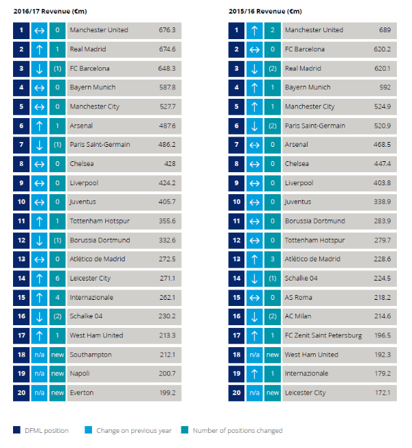 Come si può vedere, la prima società italiana è la Juventus al 10° posto, con l’Inter al 15° e il Napoli al 19°. Dalla top 20 poi sono usciti rispetto alla stagione 2015/2016 sia il Milan che la Roma.