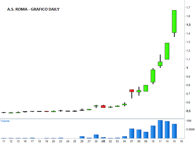 La performance più eclatante è quella finora realizzata dal titolo A.S. Roma, che stamattina ha toccato il massimo più alto dall’estate del 2002 a 1,9€. Le azioni ASR mostrano attualmente un rialzo del 10,72% a 1,849 euro. Da inizio mese il titolo sta guadagnando più del 200%!!! Qui il boom delle azioni deriva non solo dall’effetto-Thohir, ma anche dalle eccezionali prestazioni calcistiche della squadra guidata dal tecnico francese Rudi Garcia, che finora ha totalizzato 7 vittorie nelle prime 7 giornate del campionato di serie A.
