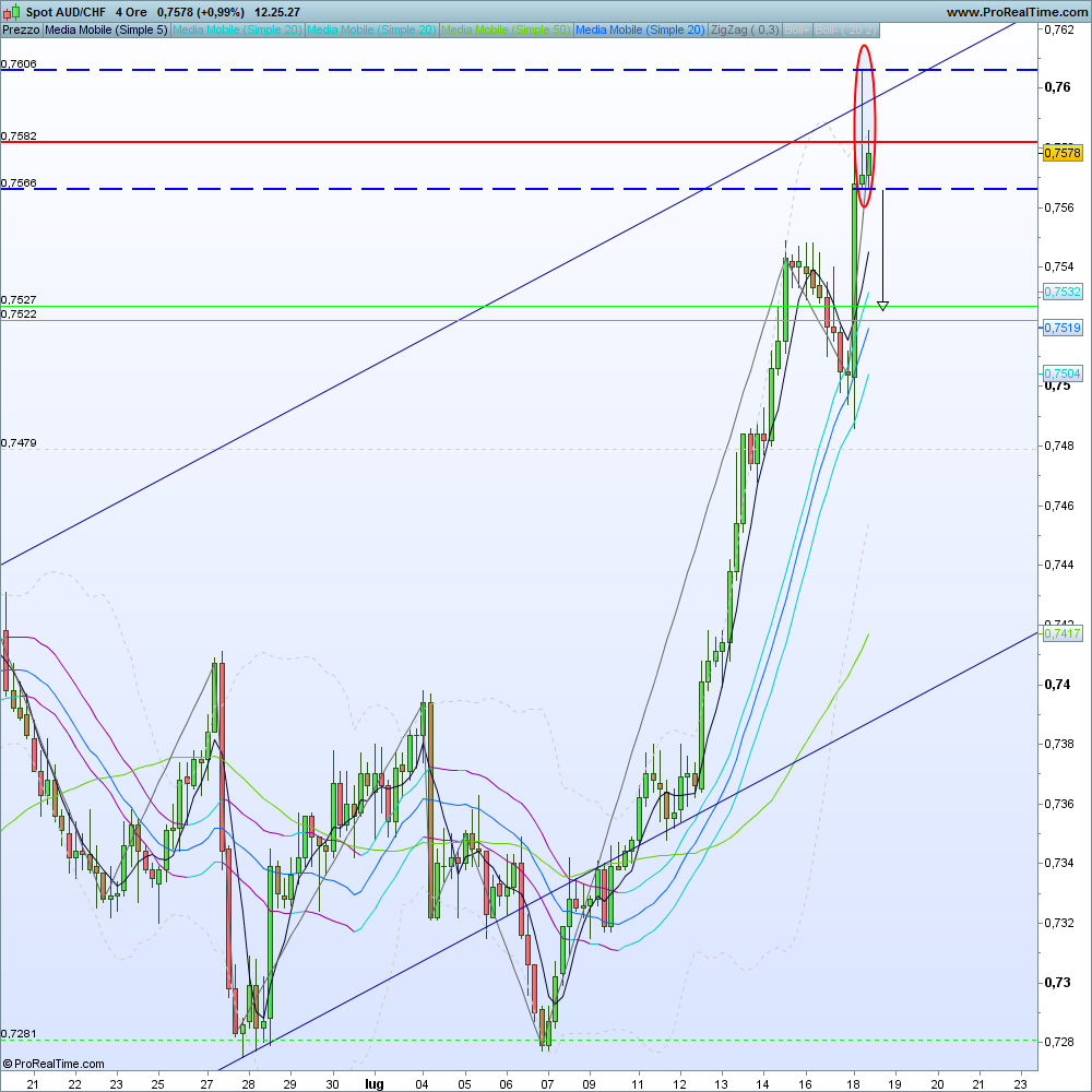 Il grafico a quattro del cambio AUD/CHF segnala la possibilità di un ingresso short di breve periodo sfruttando una particolare candela chiamata pin candle (candela pinocchio).
