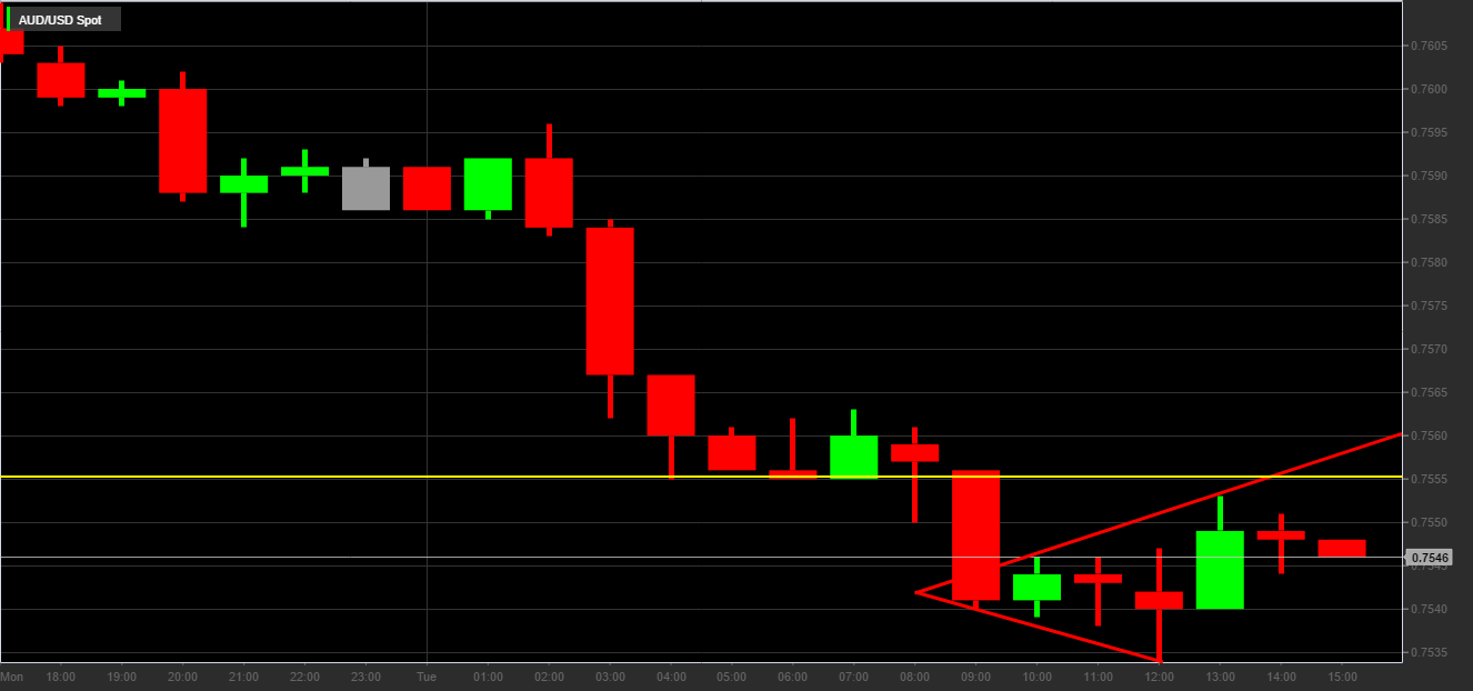 Nel caso specifico la coppia AUD/USD mostra in H1 un triangolo aperto al contrario la cui trendline superiore poggia sui massimi delle candele delle 10.00 e delle 13.00, mentre la trendline inferiore ha i punti di contatto sui minimi decrescenti delle candele delle 09.00 e delle 12.00.