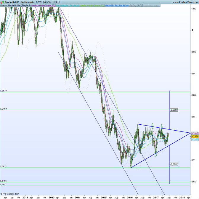 Come si osserva sul grafico settimanale riportato in basso, i prezzi scambiavano all’interno di un canale ribassista che parte dal massimo segnato a quota 1,0582 l’8 aprile 2015 fino al minimo segnato a quota 0,6828 il 18 gennaio 2016. Da tale minimo la quotazione del cambio AUD/USD è entrata in una fase di congestione con massimi e minimi che hanno assunto la forma tipica di un triangolo simmetrico.