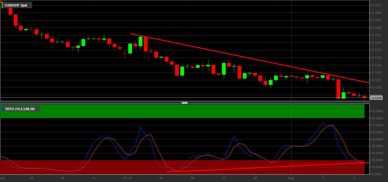 Osservando il cross CAD/CHF in H4 si potrà facilmente notare come dal 13 aprile sul massimo in area 0.76 sia partito un trend al ribasso che ha fatto scivolare il prezzo all’attuale livello di 0,7215. Comparando il grafico del prezzo con uno stocastico (14,3,3) è subito evidente come le linee K e D, in zona ipervenduto, permettano di tracciare sui loro minimi una trendline rialzista divergente rispetto al trend ribassista del prezzo.