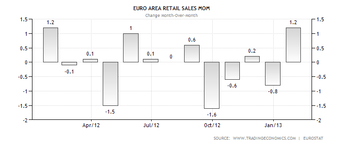 Alle 11:00 di questa mattina saranno pubblicati i dati sulle vendite al dettaglio dell’Eurozona: si prevede un calo dello 0.2% dopo il guadagno sorprendente relativo al mese di gennaio: +1.2%.