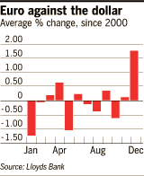 Secondo l’analisi della Lloyd, infatti, le performance mensili dell’Euro, dal 2000 in avanti, rivelano che in media, durante il mese di dicembre l’Euro incassa notevoli guadagni contro il dollaro, stimati ad una media del 1.75% (nonostante lo scorso anno abbia subito un calo) in un fenomeno che sembra rinvigorire la moneta unica, piuttosto che indebolire il "greenback".